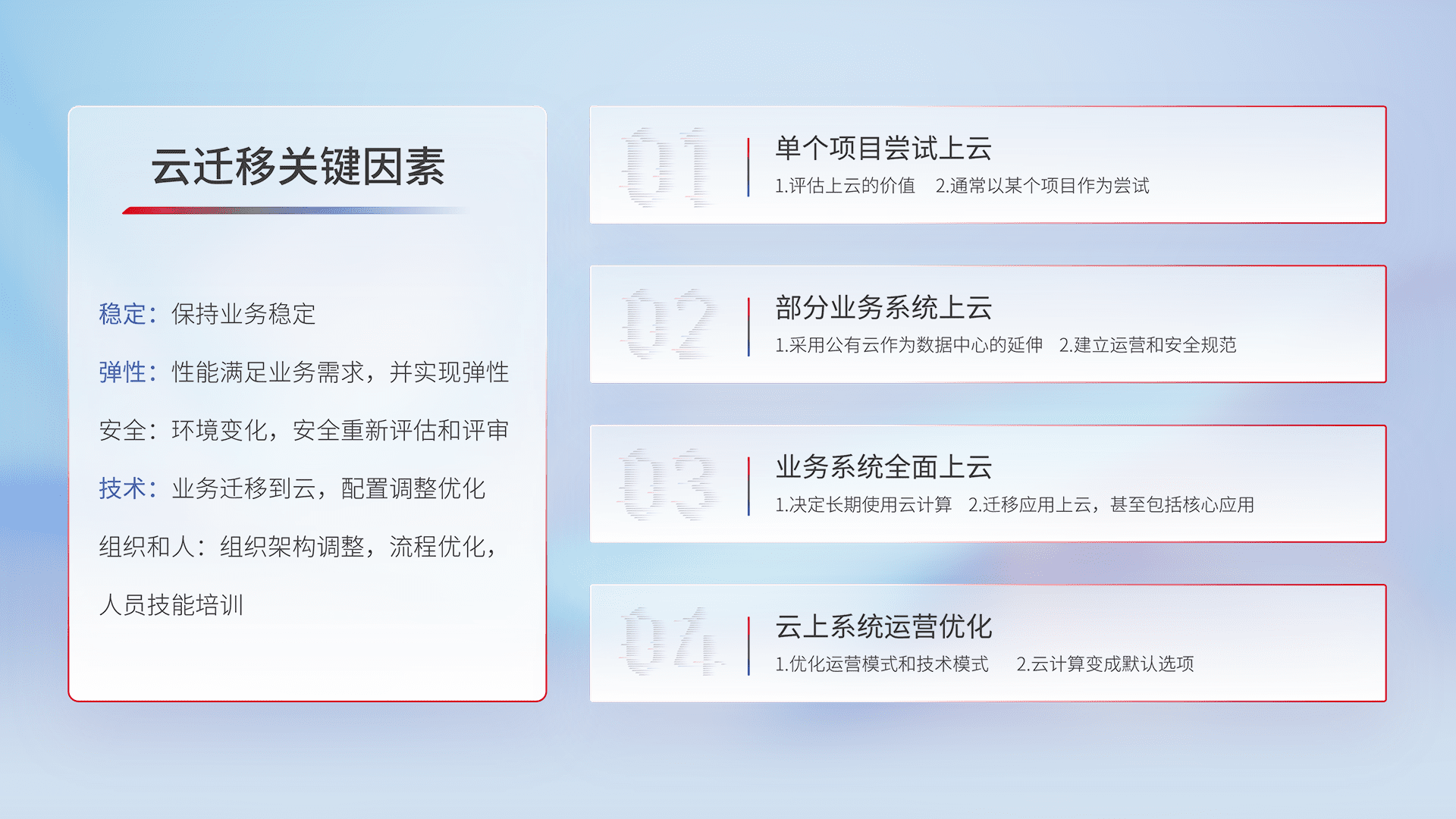 结合实际业务,,从规划设计、、、云平台选型、、、、云原生改造、、、数据迁移、、、、集成交付,,,迁移全过程为客户识别最佳上云路径,,,,做好风险识别管理,,,,设计网络架构、、、、身份权限、、、安全审计合规、、、、操作审计、、日志审计、、、监控告警策略、、、、多站点容灾设计等,,对云上基础设施进行整体规划,,,,提升IT治理水平,,以满足弹性、、、高可用、、、、高性能的需求。。。